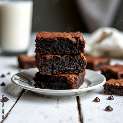 Fresh homemade fudgy brownies stacked on a saucer over a white rustic wooden table. Extreme shallow depth of field with blurred background and a glass of milk.