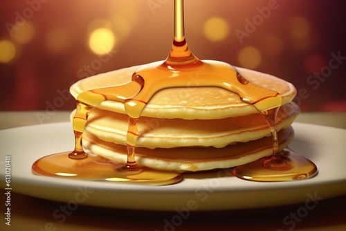 Fresh hot pancakes, topped with maple syrup, served on a plate. Generated Ai