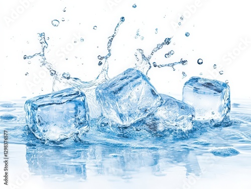 Fresh Ice Cubes Splashing in Clear Water with Bubbles and Ripples