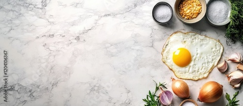 Fresh ingredients on a marble countertop including eggs, vegetables, and herbs with ample copy space for text or design elements