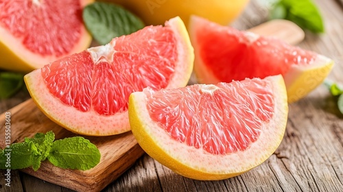 Fresh Juicy Grapefruit Slices on a Wooden Board Surrounded by Mint Leaves : Generative AI
