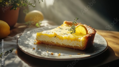 Fresh Lemon Tart with Creamy Filling and Garnish of Thyme Sprigs
