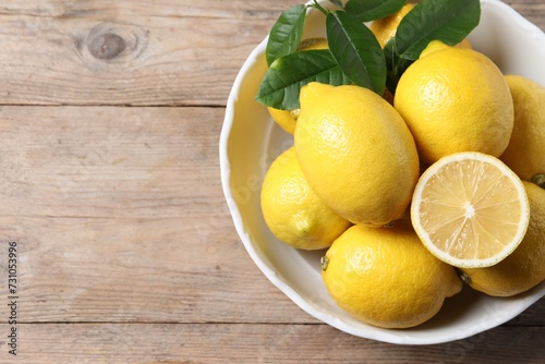 Fresh lemons and green leaves on wooden table, top view. Space for text