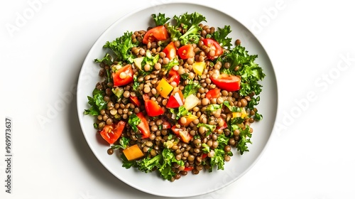 Fresh lentil salad with kale, tomatoes, and peppers on a white plate
