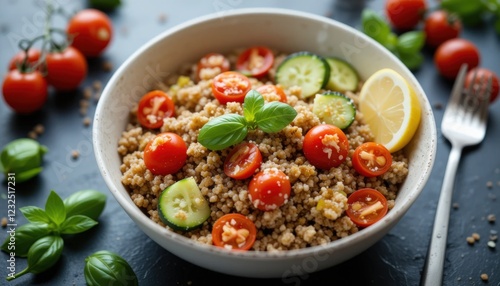 Fresh Mediterranean grain bowl with quinoa, cherry tomatoes, cucumbers, fresh basil leaves, and a lemon wedge on a dark tabletop, perfect for healthy eating inspiration and diet focused content