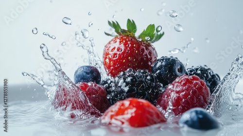 Fresh Mixed berry levitating with dynamic water splashes surrounding them, set against a light grey background, isolated with copy space.