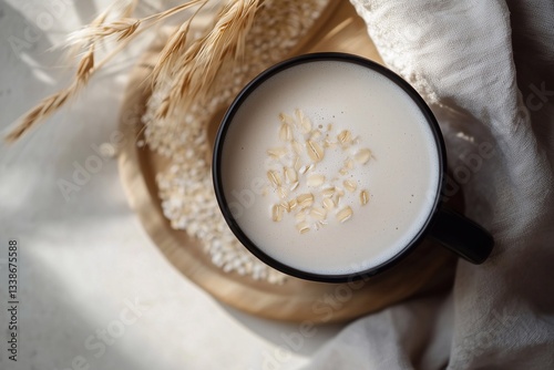 Fresh Oat Milk in a Cozy Cup With Oats and Grains on a Wooden Tray During a Bright Morning Generative AI