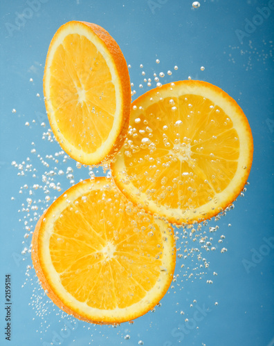 Fresh orange dropped into water with bubbles.