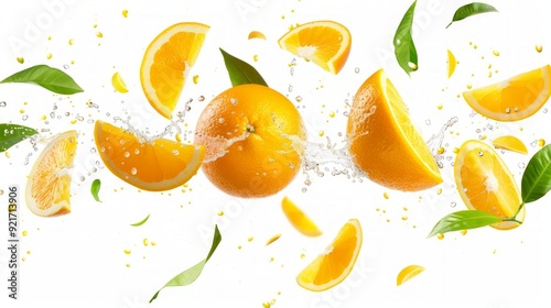 Fresh orange fruit whole and slices with drops and leaves falling flying isolated on white background