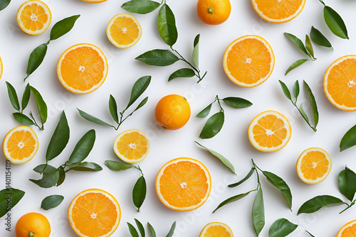 Fresh oranges and green leaves create vibrant, colorful pattern, perfect for summer themes and healthy living