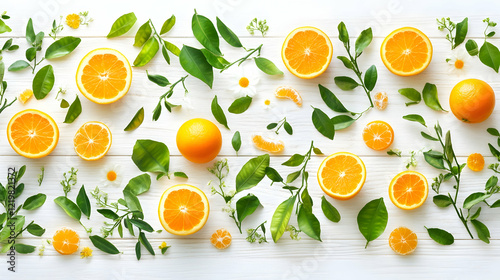 Fresh oranges, citrus leaves, flowers on white wood; healthy food flatlay