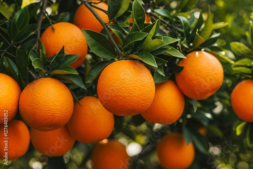 Fresh Oranges on the Tree, Ready to Harvest. Close-up view of ripe oranges hanging on a tree branch, with vibrant green leaves.