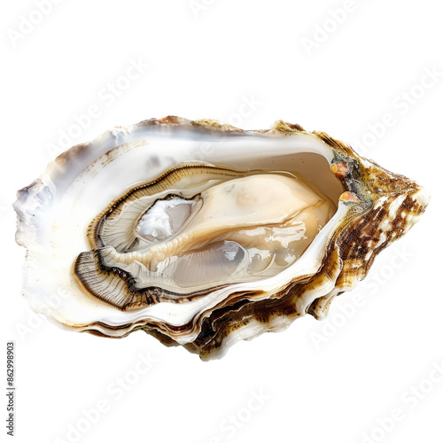 Fresh oyster on white background. A fresh oyster, shell open, revealing the delicate meat inside, isolated on a white background. Perfect for food photography, menus, and culinary publications.