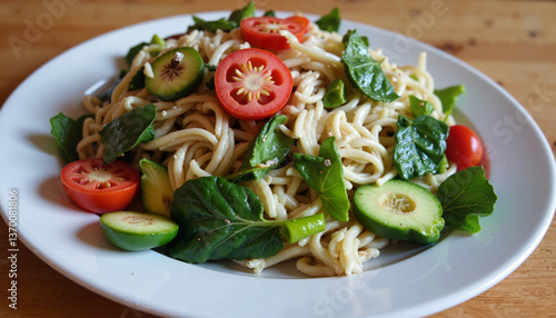 Fresh Pasta Salad with Colorful Vegetables on a White Plate