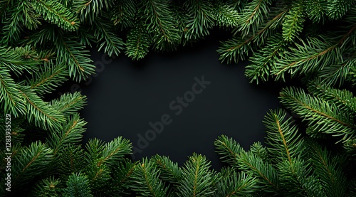 Fresh pine branches frame dark background creating natural border, copy space for winter holiday designs and seasonal messages.