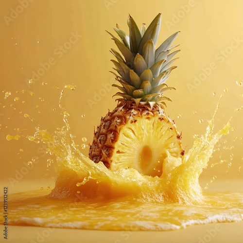 Fresh pineapple half submerged in juice splash on a vibrant yellow background studio shot