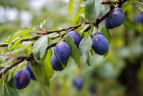 Fresh Plums on Tree Branch Surrounded by Green Leaves in Natural Orchard Environment with Raindrops on Fruit and Foliage