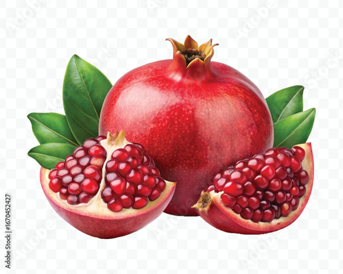 fresh pomegranate with slice and leaves in different style isolated on transparent background