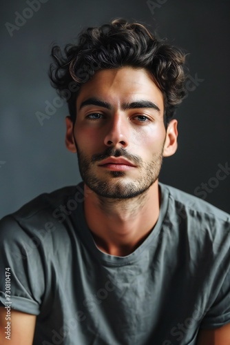 Fresh portrait of a beautiful young model man in a green .lush environment.