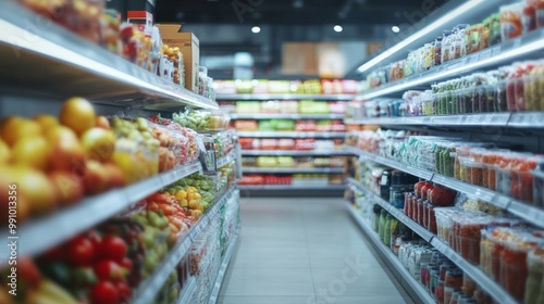 Fresh produce and beverages lined up in a grocery store aisle during daylight hours with clear visibility of colorful products