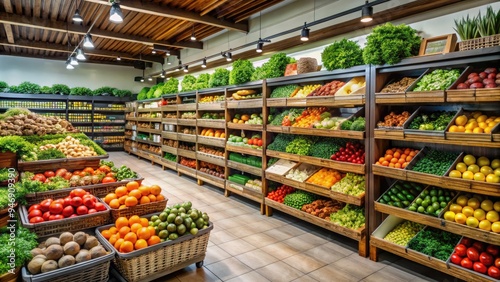 Fresh produce and packaged goods fill shelves in a well-organized grocery store, with baskets, carts, and refrigerated units stocked and ready for customers.