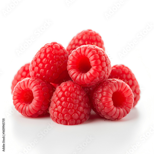 "Fresh raspberries in a small pile, placed on white background, macro detail, studio lighting"