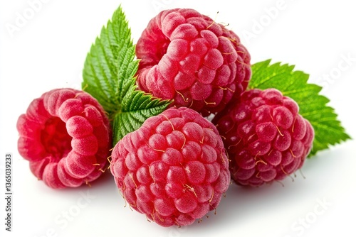 Fresh Raspberries with Green Leaves Close Up on White Background