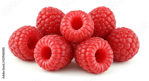 Fresh raspberry isolated on a white background, a vibrant red berry perfect for organic food branding, healthy eating, and fruit-based designs. Raspberries with green leaves vegan vegetarian fruit