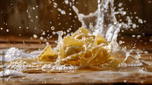 Fresh ravioli splashing in water, highlighting the delicate pasta texture and dynamic movement in a culinary scene.