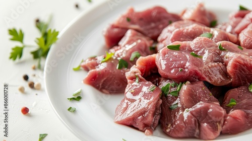 Fresh raw chicken hearts, ready for culinary use, displayed on a clean white plate, detailed textures, rich colors, appetizing presentation