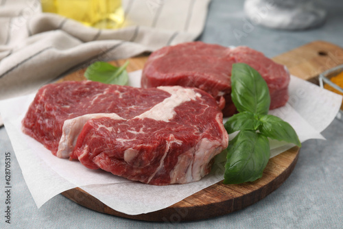 Fresh raw cut beef and basil leaves on grey table, closeup