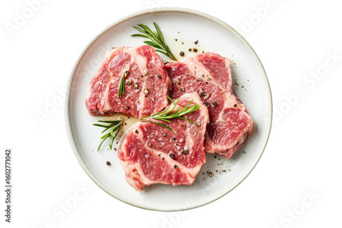Fresh raw lamb chops with seasoning and rosemary sprigs on plate on transparent background