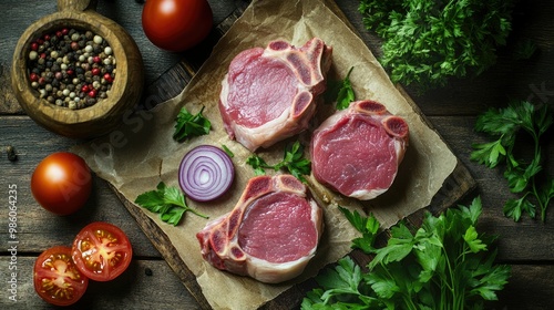 Fresh raw pork steaks with purple onions, parsley, and tomatoes, placed on a rustic table for a fresh, hearty meal concept