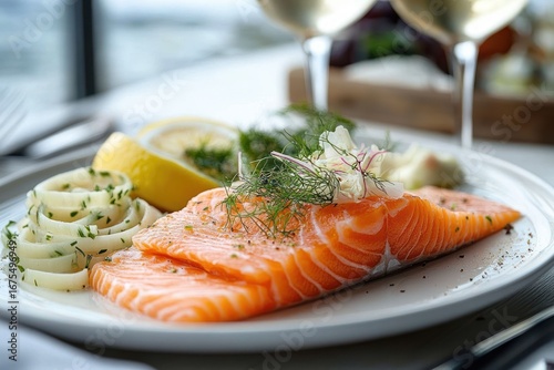 Fresh raw salmon fillet garnished with herbs and accompanied by lemon wedge and sliced onions on a white plate with a blurred background of wine glasses