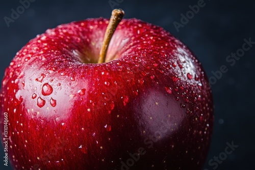 Fresh red apple glistening with water droplets against a dark background in a simple and elegant setting