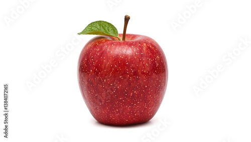 Fresh red apple with a glossy finish and green leaf on a clean white backdrop Perfect for food and health concepts