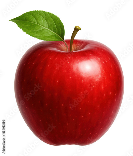 Fresh red apple with a green leaf attached to the stem on transparent background.