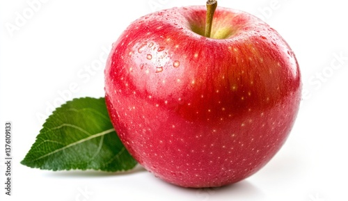 Fresh Red Apple with Water Droplets and Leaf Isolated on White