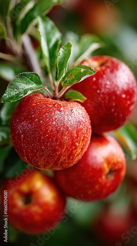 Fresh Red Apples on Tree Branch with Water Droplets, Close-up