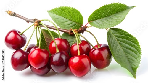 Fresh Red Cherries on Branch with Leaves
