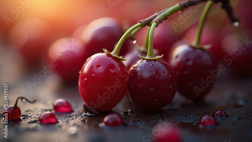 Fresh red cherries with water droplets on a dark surface