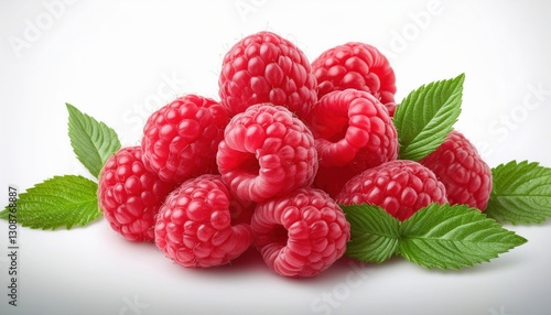 Fresh red raspberries with vivid color and a crisp green leaf, isolated on a clean white background. Ideal for food packaging, health ads, and organic product designs.