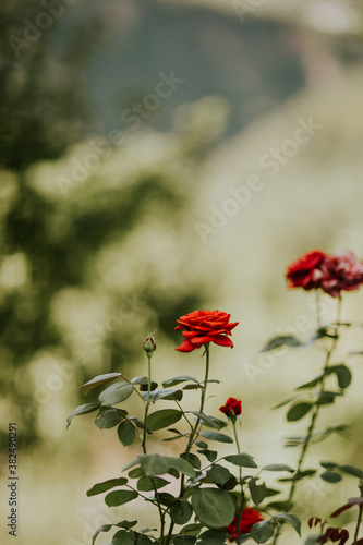 Fresh red rose and buds on a bush