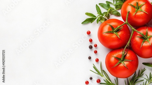 Fresh Red Tomatoes Rosemary and Peppercorns on White Background