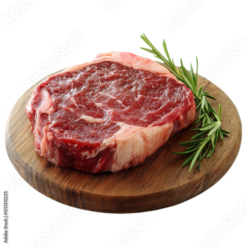 Fresh ribeye steak on wooden cutting board with rosemary, showcasing its marbled texture and rich color