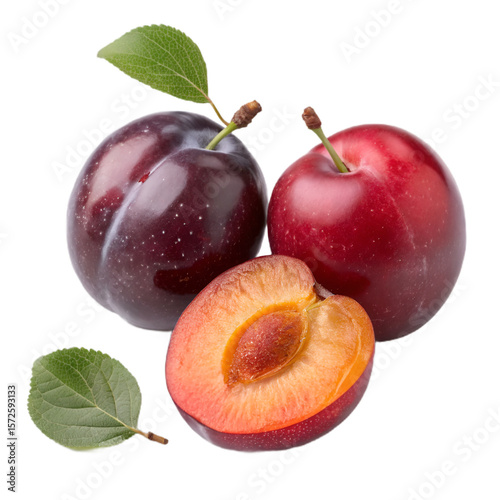 Fresh ripe plums present a vibrant and juicy display, featuring a halved fruit revealing its inner beauty on a dark backdrop.