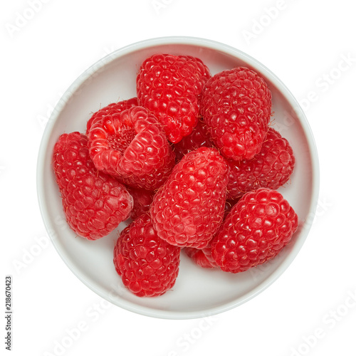 Fresh ripe raspberries in ceramic bowl isolated on white background. Ingredients for cooking. Top view.
