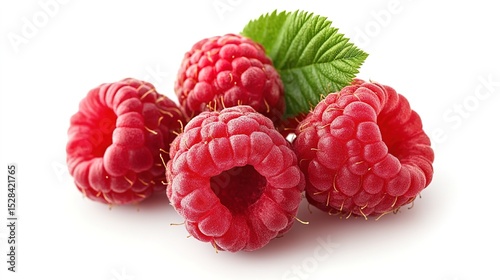 Fresh, ripe raspberries with a green leaf on a white background, showcasing their vibrant red color and textured surface.