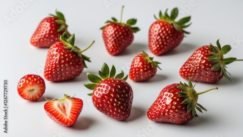 Fresh ripe strawberries arranged on a white surface with one sliced strawberry showing red flesh and seeds Copy Space