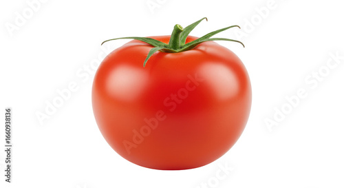Fresh ripe tomato with vibrant red color and green leaves isolated on white background
